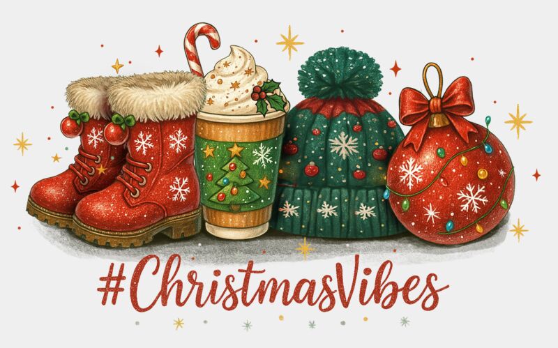 A festive and cozy design featuring warm Christmas boots, a holiday drink topped with whipped cream and a candy cane, a cheerful Christmas beanie, and a shiny bauble — all tied together with the hashtag #ChristmasVibes. Perfect for anyone who loves cozy holiday aesthetics and cheerful seasonal spirit!