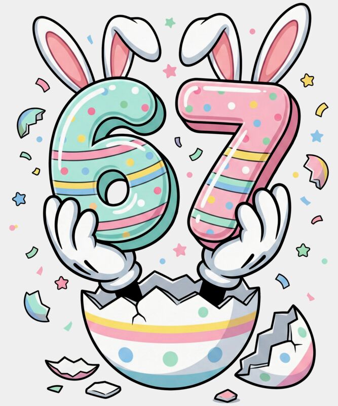 A funny and eye-catching Easter design featuring a cracked Easter egg with two hands popping out holding the numbers “67,” each wearing cute bunny ears. Playful and meme-inspired, this quirky design blends Easter fun with cheeky humour. Perfect for Easter shirts, holiday parties, novelty gifts, and anyone who enjoys lighthearted seasonal designs with a twist.