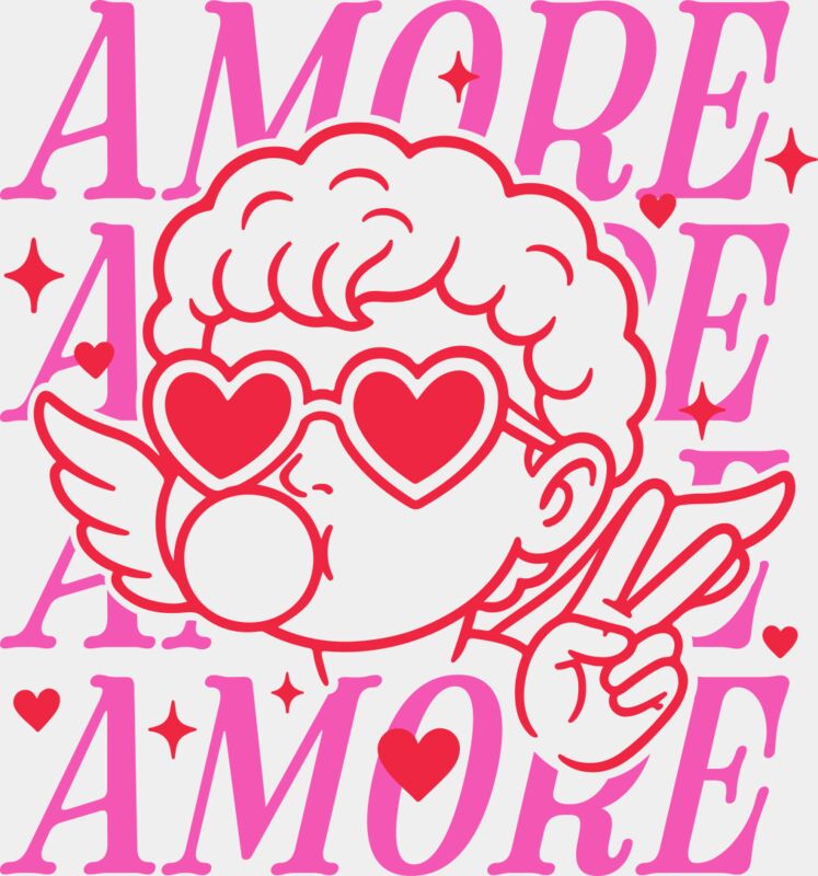 A fun and playful love-themed design featuring a cool cupid wearing heart-shaped sunglasses, blowing a bubble, and flashing a peace sign. The word “AMORE” appears four times in the background, surrounded by pink and red stars and heart details for an extra pop of romance. Perfect for Valentine’s Day, Galentine’s celebrations, or anyone who loves bold, flirty artwork with a modern twist. Ideal for t-shirts, hoodies, tote bags, mugs, and standout love-themed gifts. 💘✨