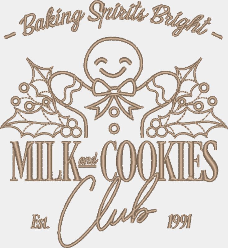 A festive embroidery featuring the text "Baking Spirits Bright" above a cute gingerbread man with Milk and Cookies Club text in a health club style logo font