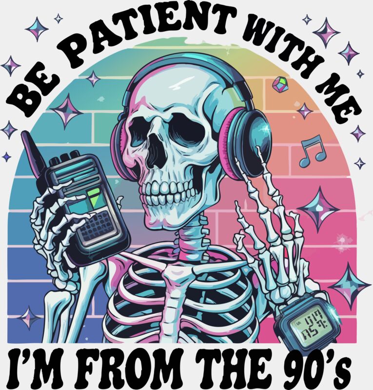 A bold and nostalgic design featuring a cool skull wearing headphones, holding a retro brick phone, and rocking a chunky watch, surrounded by star accents on a soft pastel background. Paired with the playful text “Be Patient With Me” at the top and “I’m From The 90’s” at the bottom, this design perfectly captures a fun, throwback vibe. Inspired by the messy girl and Type B personality aesthetic, it’s ideal for mums who embrace a laid-back, carefree attitude with a touch of humour. Perfect for Mother’s Day, casual wear, and everyday outfits, this unique and eye-catching graphic makes a great choice for mum t-shirts and expressive personalised apparel.