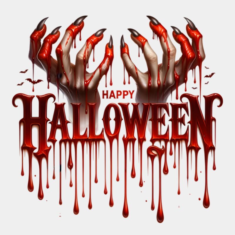 This chilling design features clawed hands dripping with blood, rising behind the words “Happy Halloween” in a gory, red-dripped font. Perfect for horror fans and those who love their Halloween extra dark, spooky, and sinister.