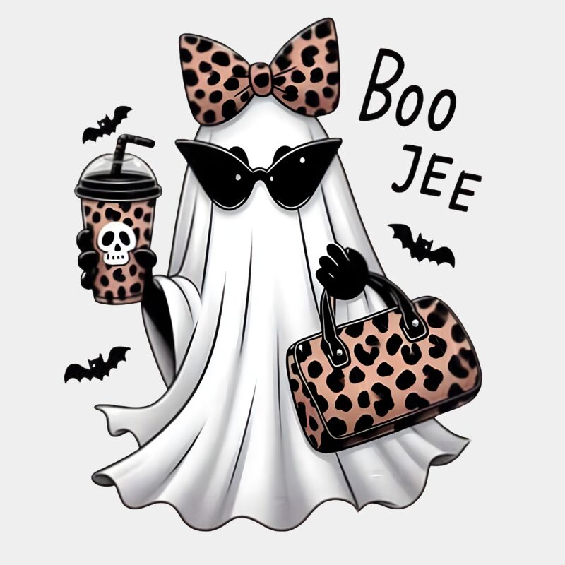 Spooky, stylish, and a little sassy — this boujee ghost knows how to haunt in high fashion. Rocking oversized leopard-print sunglasses, a matching bow, chic handbag, and a spooky drink in hand, she’s the life (or afterlife) of the party. Surrounded by bats and leopard print flair, this design screams Boo Jee energy for the ghost who haunts in style.
