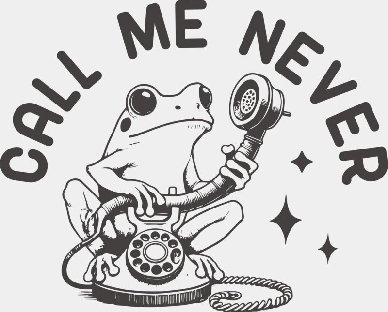 A playful and humorous design featuring the text “CALL ME NEVER” at the top, paired with a quirky illustration of a frog sitting on a vintage rotary dial phone while holding the handset. Perfect for introverts, anti-social humour lovers, or anyone who enjoys a fun, sarcastic twist on retro graphics. Ideal for t-shirts, hoodies, tote bags, mugs, and novelty gifts that celebrate ignoring calls in style. 🐸📞