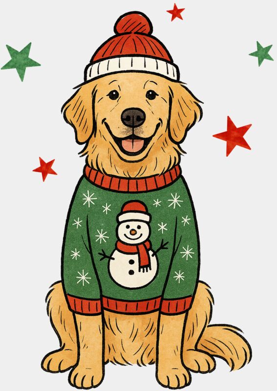 A cheerful and festive Christmas design featuring a smiling labrador wearing a cosy Christmas beanie and a holiday jumper with a cute snowman on the front. Finished with a festive background of five stars in classic red or green, this joyful artwork is perfect for dog lovers and holiday enthusiasts alike. Ideal for Christmas t-shirts, jumpers, hoodies, mugs, tote bags, and seasonal gifts.