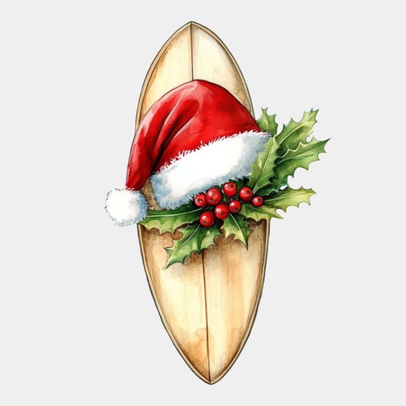 Bring a touch of tropical happiness and gift-giving spirit to your collection with this Christmas Surfboard design. Great for tote bags, tshirts or hats.