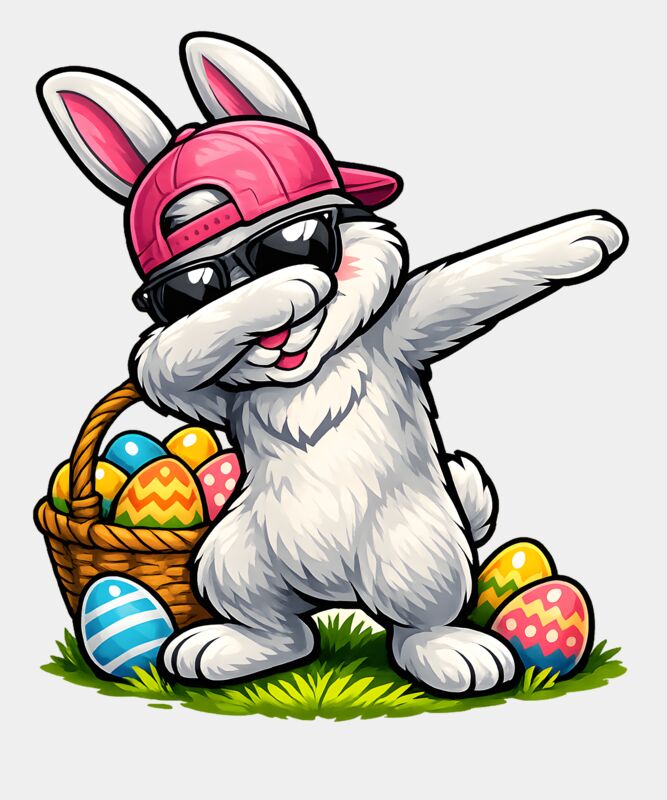 A fun and playful Easter design featuring a cool rabbit dabbing, wearing sunglasses and a cap, ready for the ultimate egg hunt. Beside the bunny is an Easter basket filled with colourful Easter eggs, adding a festive and cheerful holiday vibe. Perfect for Easter egg hunts, family gatherings, and spring celebrations. This humorous Easter design looks great on t-shirts, hoodies, and kids’ apparel, making it a fun choice for anyone who loves quirky holiday style.