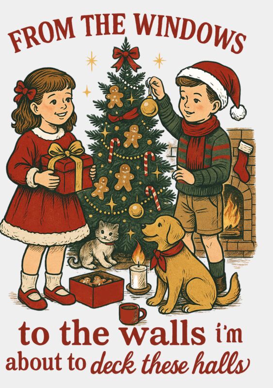 A funny vintage-style Christmas design featuring a retro illustration of two kids decorating a Christmas tree with ornaments, gingerbread cookies, and candy canes, alongside a cute dog and kitten. Surrounded by text that reads, “From the windows to the walls I’m about to deck these halls.” Perfect for nostalgic holiday humor and festive vibes!
