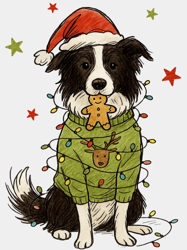 An adorable Christmas design featuring a sitting border collie dressed for the season in a cosy jumper, wrapped in colourful Christmas lights, and wearing a classic Santa hat. Holding a gingerbread treat in its mouth, this charming illustration is perfect for Christmas t-shirts, hoodies, tote bags, mugs, and festive gifts. Ideal for dog lovers, border collie fans, and anyone who loves cute, heart-warming holiday designs.