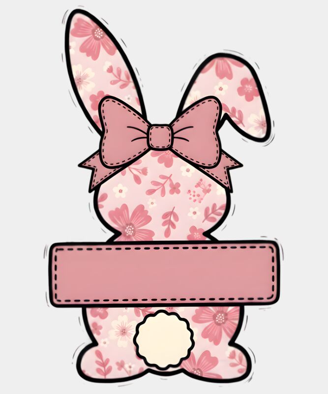 A sweet and adorable Easter design featuring a pink bunny sitting with its back facing us, decorated with pretty floral patterns and wearing a pink ribbon bow on its head. On the bunny’s back is a blank name tag space, allowing kids to write their own name and personalise their shirt for Easter celebrations and egg hunts. This cute and customisable design is perfect for kids’ Easter events, school activities, and family egg hunts, making it a lovely choice for personalised Easter t-shirts and festive spring apparel.