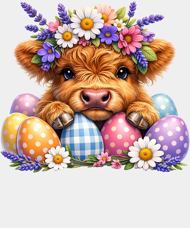 A sweet and charming Easter design featuring a cute cow wearing a beautiful flower crown, surrounded by colourful Easter eggs. This soft and cheerful springtime design blends farmyard cuteness with festive Easter vibes, making it perfect for Easter celebrations, egg hunts, and seasonal apparel. A lovely choice for t-shirts, hoodies, and gifts for animal lovers who enjoy fun and adorable holiday designs.