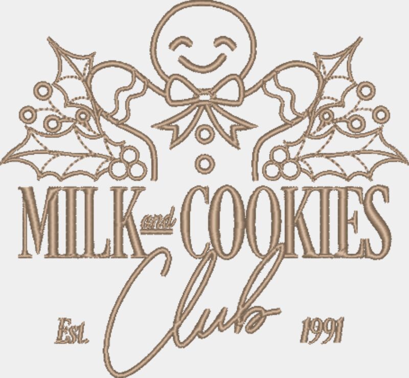A festive embroidery featuring a cute gingerbread man with Milk and Cookies Club text in a health club style logo font