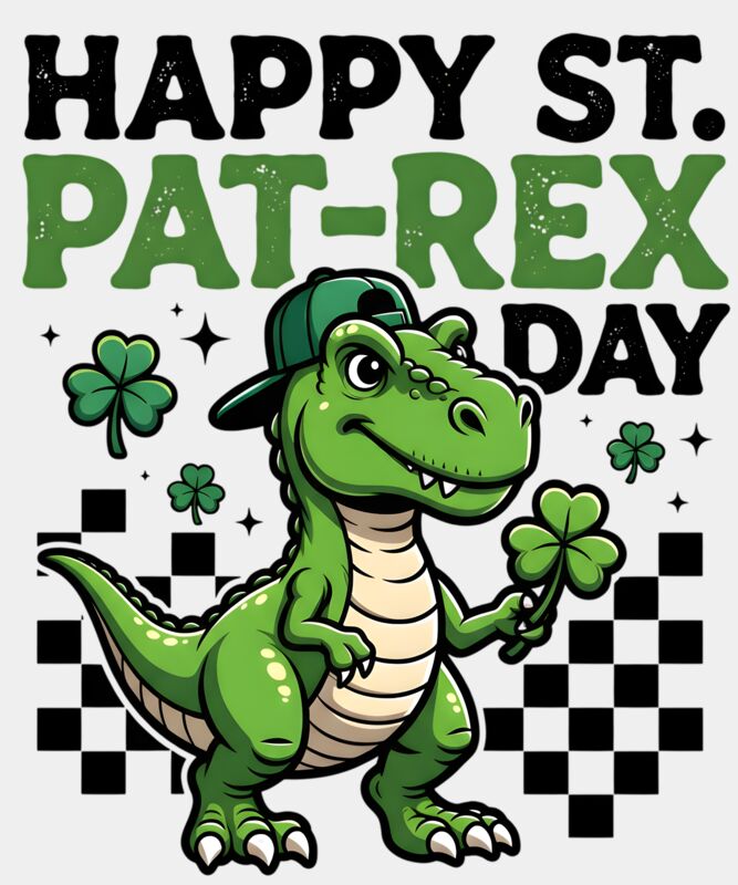 A fun and playful St. Patrick’s Day design featuring a T-Rex wearing a backwards cap, holding a clover with three smaller clovers around him. Paired with the cheeky phrase “Happy St Pat-Rex Day,” this design blends prehistoric fun with festive Irish charm. Perfect for St. Paddy’s Day parties, kids or adult apparel, and anyone who loves whimsical, humorous designs with a lucky twist.