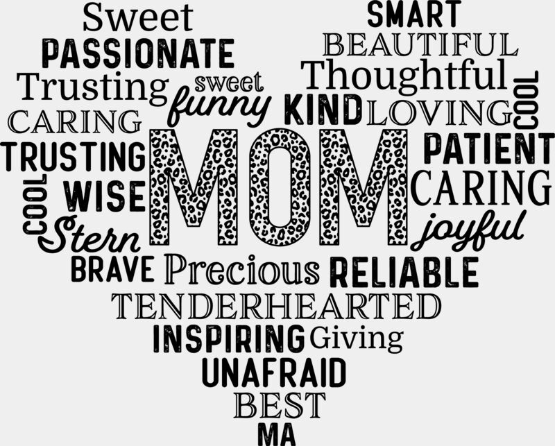 A beautiful text-based Mother’s Day design featuring “MOM” at the center, surrounded by words that describe her—strong, loving, caring, and more—shaped into a heart. Simple, meaningful, and heartfelt, this design celebrates all the qualities that make mothers so special. Perfect for tees, hoodies, or gifts, it’s a timeless way to honor Mum with love and appreciation.