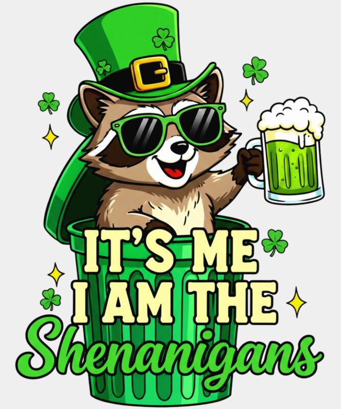A hilarious and festive St. Patrick’s Day design featuring a mischievous raccoon popping out of a green trashcan, wearing a leprechaun hat and green sunglasses while holding a glass of green beer. Surrounded by clovers and stars, the design is topped off with the cheeky phrase “It’s Me, I Am The Shenanigans” at the bottom. Perfect for party-goers, lovers of humor, or anyone embracing the wild side of St. Paddy’s Day, this playful design brings luck, mischief, and festive fun all in one.