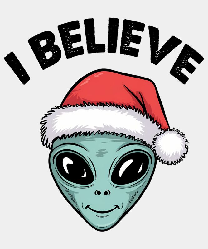 A fun and festive Christmas design featuring an alien head wearing a Santa hat, with the phrase “I Believe” written above it. Blending holiday cheer with a playful extraterrestrial twist, this design is perfect for Christmas t-shirts, hoodies, totes, mugs, and gifts for UFO fans, sci-fi lovers, and anyone who believes in a little Christmas magic… or something out of this world. A quirky and eye-catching festive favourite!