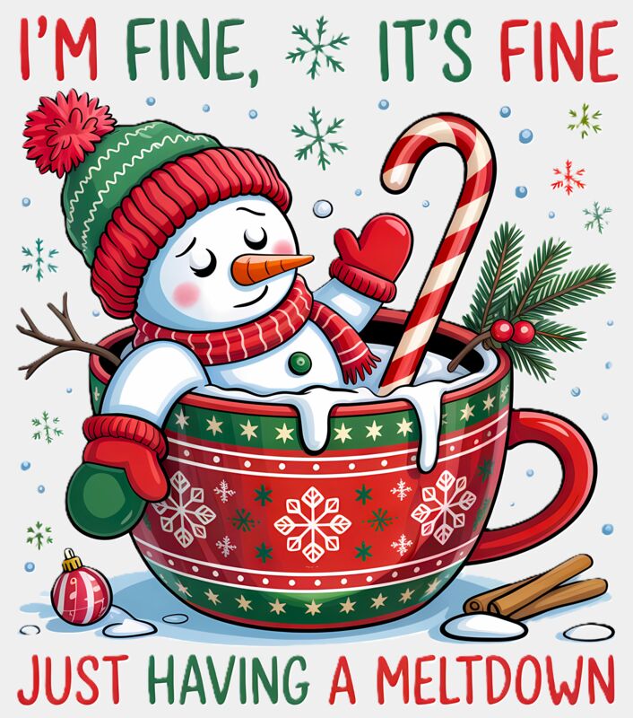 This hilarious Christmas design features a snowman sinking into a cup of white hot chocolate, complete with a candy cane and festive decorations. Paired with the cheeky phrase “I’m fine, it’s fine… just having a meltdown,” it’s the perfect mix of festive humor and holiday charm for anyone who handles Christmas chaos with a smile.