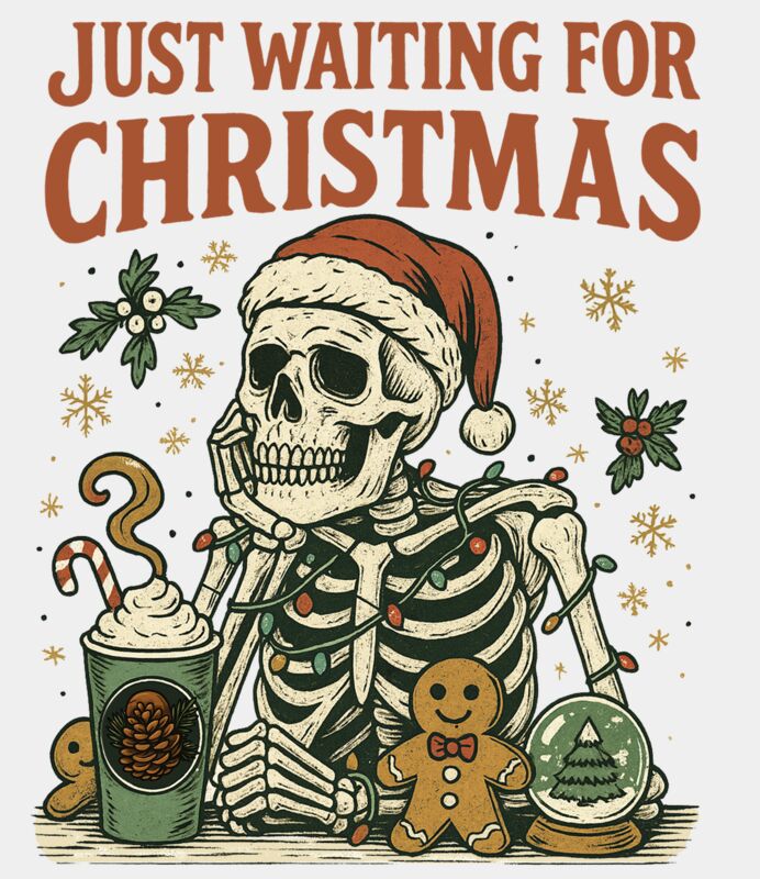 A fun and festive design featuring a skeleton in a Santa hat, wrapped in Christmas lights, resting its head in anticipation of the holidays. Surrounded by holiday treats like hot cocoa, a gingerbread cookie, and a snow globe, this artwork captures the mix of spooky and merry with the phrase “Just Waiting for Christmas.” Perfect for anyone who loves a gothic twist on holiday cheer.