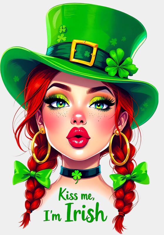 A festive and playful St. Patrick’s Day design featuring a cheerful girl wearing a classic green St. Patrick’s hat, paired with the phrase “Kiss Me, I’m Irish” at the bottom. Perfect for celebrating Irish pride, holiday fun, or St. Patrick’s Day parties, this design blends charm, personality, and a touch of cheeky humor. Ideal for tees, hoodies, or accessories, it adds a spirited and lively touch to any festive outfit.