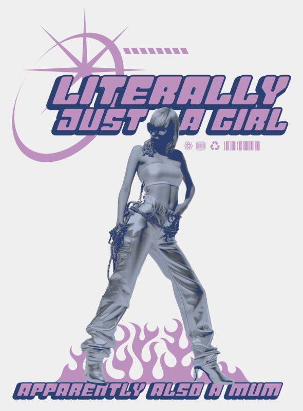 Playful Y2K-inspired “Literally Just a Girl… Apparently Also a Mum” design featuring retro futuristic styling and bold typography. Perfect for millennial mums who love humour, nostalgia, and stylish statement pieces. Ideal for Mother’s Day gifts, casual wear, and relatable mum life moments.