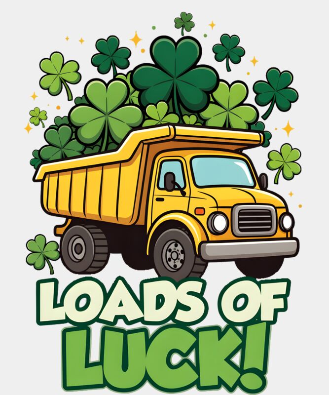 A cheerful and festive St. Patrick’s Day design featuring a bright yellow truck overflowing with four-leaf clovers in the back. Paired with the playful phrase “Loads of Luck!” at the bottom, this design celebrates holiday cheer and good fortune in a fun, whimsical way. Perfect for tees, hoodies, or accessories, it’s a lively and charming way to share some St. Paddy’s Day luck.