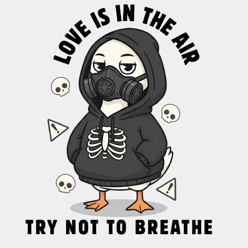 A darkly humorous and edgy design featuring a duck wearing a gas mask and a black hoodie with a skull graphic, hands tucked into the kangaroo pocket. Surrounded by skulls and warning symbols, the design reads “LOVE IS IN THE AIR” at the top and “TRY NOT TO BREATHE” beneath the duck. Perfect for those who love sarcastic, anti-romance humour with a bold streetwear edge. Ideal for t-shirts, hoodies, tote bags, and statement pieces that lean into dark Valentine vibes and rebellious style. 🦆☣️