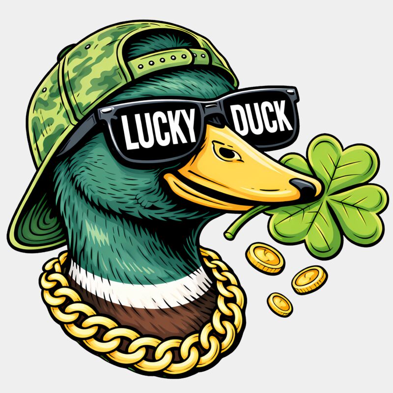 A bold and playful St. Patrick’s Day design featuring a stylish duck with attitude—wearing sunglasses, a gold chain, and a backwards camo cap. One lens of the sunglasses reads “Lucky” and the other “Duck,” while a four-leaf clover rests in its beak and three gold coins tumble beneath. Full of personality and festive flair, this design blends humor, luck, and street-style vibes, perfect for St. Paddy’s Day apparel, accessories, or gifts that stand out.