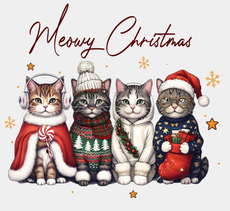 A festive design featuring 4 adorable cats dressed in Christmas outfits with “Meowy Christmas” written above them. Perfect for cat lovers and holiday cheer!