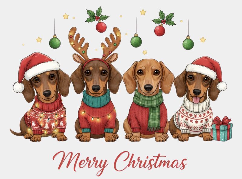 A heartwarming Christmas design featuring four adorable dachshund puppies dressed in festive jumpers, Santa hats, reindeer ears, and a cozy scarf. One pup is wrapped in colorful Christmas lights, with “Merry Christmas” text below and sparkling baubles and stars above — perfect for dog lovers and holiday cheer!