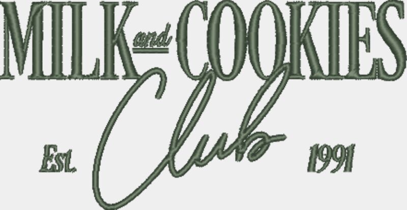 A cute festive embroidery of a Health Club style text based logo that reads Milk and Cookies Club Est 1991