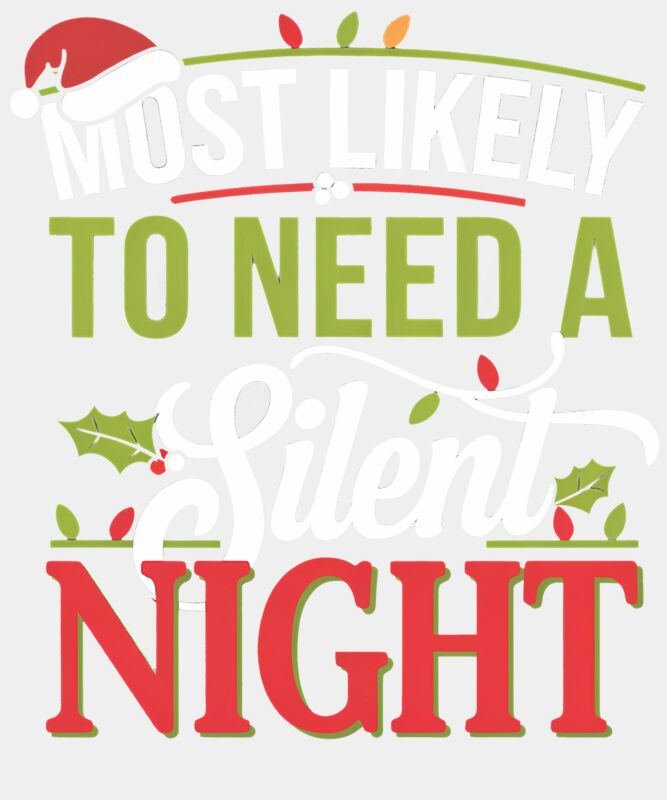 A clean and festive Christmas design featuring the phrase “Most Likely to Need a Silent Night,” accented with a small selection of classic holiday decorations such as subtle snowflakes, baubles, or greenery. Designed with a simpler layout for a modern, understated festive look, this design is perfect for Christmas t-shirts, sweatshirts, pyjamas, mugs, and holiday gifts. Ideal for parents, teachers, introverts, and anyone who needs a little peace and quiet during the busy Christmas season.