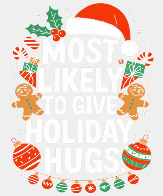 A cheerful and heart-warming Christmas design featuring the phrase “Most Likely to Give Holiday Hugs,” surrounded by festive elements including smiling gingerbread characters, candy canes, Christmas baubles, wrapped presents, holly leaves, snowflakes, and a Santa hat perched on the text. Bright, playful colours and classic holiday icons make this design perfect for Christmas t-shirts, jumpers, pyjamas, tote bags, and holiday gifts. Ideal for anyone known for spreading warmth, kindness, and festive cheer during the Christmas season.