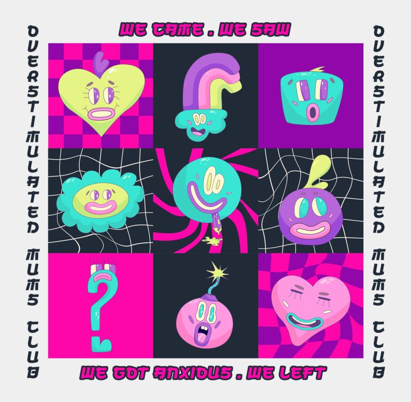 Relatable and humorous “Overstimulated Mum’s Club” design with bold Y2K colours and playful icons. Perfect for busy mums juggling it all, this design speaks to real mum life with a fun, nostalgic twist. Great for gifting or everyday wear.