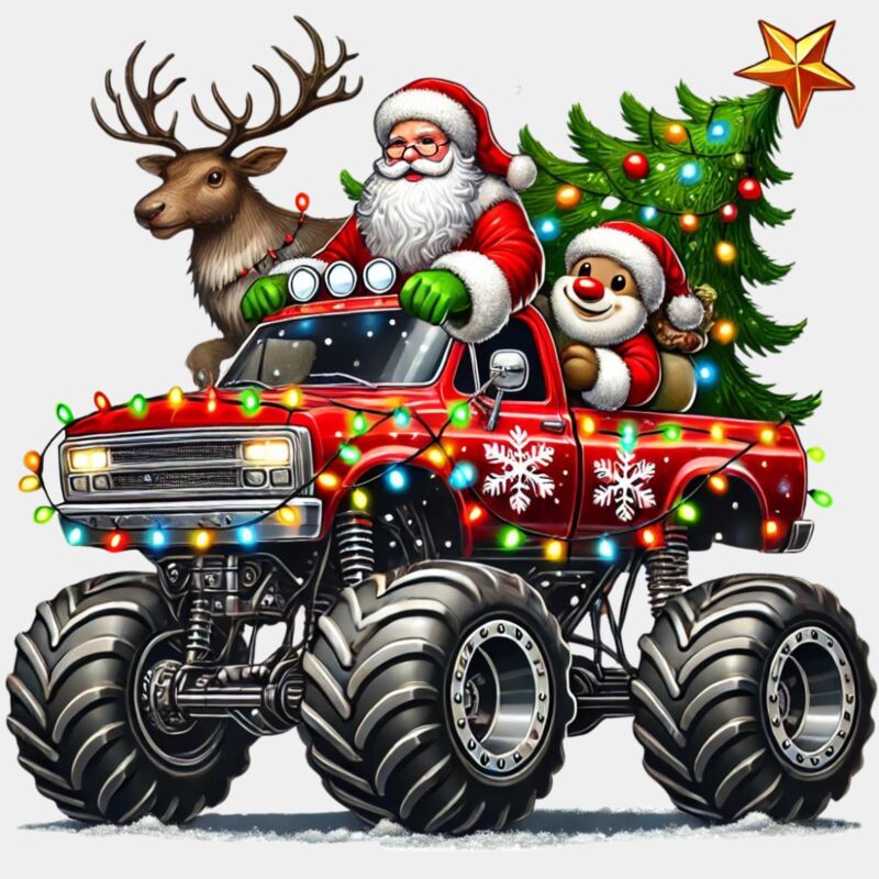 A fun and festive design featuring Santa driving a red monster truck decked out in Christmas lights, with a reindeer, snowman, and Christmas tree in the back. Perfect for car lovers and Christmas enthusiasts alike!