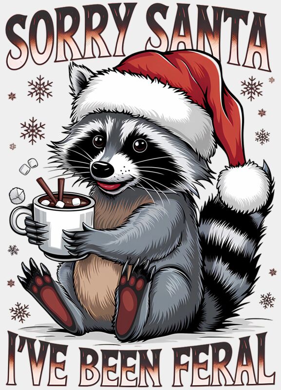 A cheeky Christmas design featuring a raccoon in a Santa hat, holding a warm cup of cocoa topped with marshmallows and chocolate sticks. With the playful phrase “Sorry Santa, I’ve Been Feral,” this design adds a funny and mischievous twist to holiday celebrations. Perfect for anyone who loves cute animals with a bit of attitude.