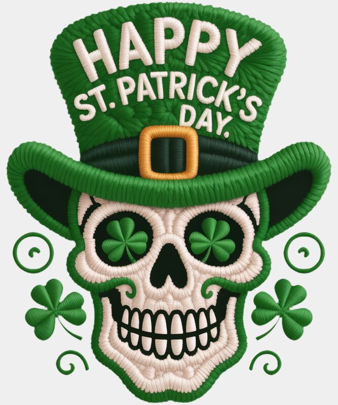 A bold and eye-catching St. Patrick’s Day design featuring a vibrant candy skull wearing a classic green leprechaun hat. On the hat, the words “Happy St Patrick’s Day” add a festive touch, blending edgy style with Irish celebration. This unique design mixes colorful sugar-skull vibes with lucky holiday elements, making it perfect for parties, pub crawls, or anyone who loves a standout, alternative take on St. Paddy’s Day spirit.
