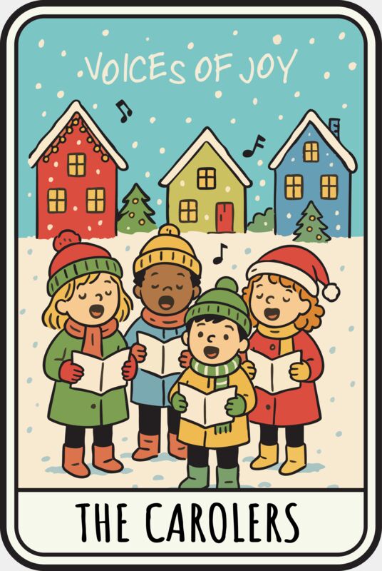 A festive and heartwarming Christmas tarot card design featuring four children singing in cozy beanies, scarves, mittens, boots, and jackets. The snowy background includes three houses, decorated Christmas trees, music notes, and gentle falling snow. The top reads “VOICES OF JOY,” while the white section at the bottom displays “THE CAROLERS” in classic tarot style. Perfect for holiday enthusiasts, music lovers, and anyone who enjoys charming, nostalgic Christmas scenes. Ideal for t-shirts, hoodies, mugs, tote bags, and festive gifts that celebrate the joy of the season. 🎄❄️🎶