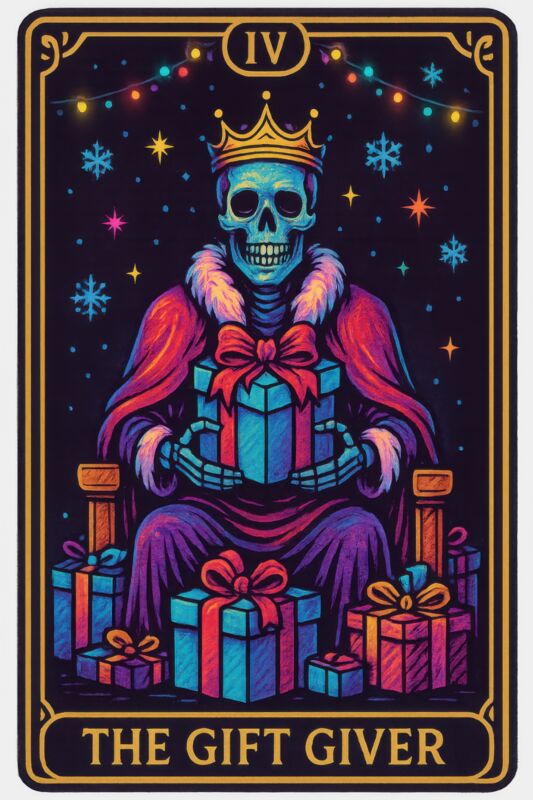 A striking Christmas tarot card–style design featuring IV at the top and a regal skeleton cloaked in festive attire, wearing a crown and seated on a throne. The figure holds a wrapped present, with additional gifts scattered at their feet, blending dark gothic aesthetics with holiday charm. Finished with “The Gift Giver” at the bottom, this unique design is perfect for Christmas apparel, tote bags, posters, stickers, and gifts for tarot lovers, gothic Christmas fans, and anyone who loves an edgy twist on festive traditions.