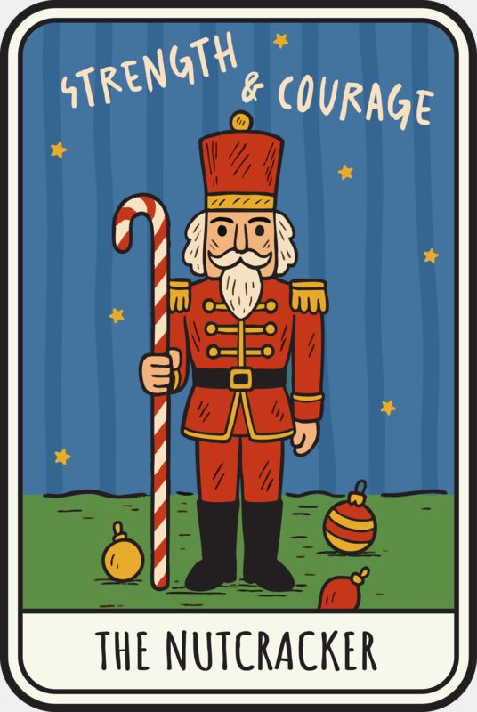 A festive and whimsical Christmas tarot card design featuring a blue striped background with green grass and scattered baubles. A classic nutcracker stands proudly holding a candy cane. The top reads “STRENGTH & COURAGE,” while the white section at the bottom displays “THE NUTCRACKER” in traditional tarot style. Perfect for holiday lovers, nutcracker enthusiasts, and anyone who enjoys charming seasonal designs. Ideal for t-shirts, hoodies, mugs, tote bags, and unique festive gifts. 🎄🧱🍬