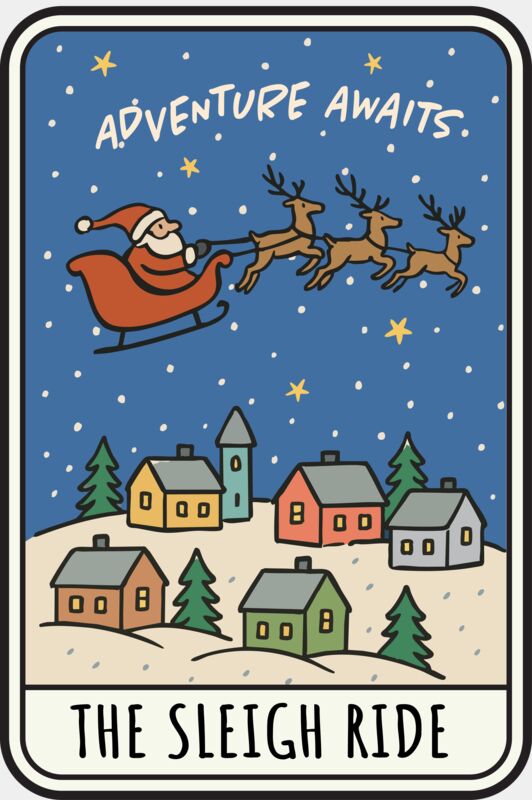A festive and magical Christmas tarot card design featuring a starry night sky with gently falling snow. Santa rides his sleigh across a snowy town, pulled by his reindeer, creating a classic holiday scene. The top reads “ADVENTURE AWAITS,” while the white section at the bottom displays “THE SLEIGH RIDE” in traditional tarot style. Perfect for holiday lovers, Santa and sleigh enthusiasts, and anyone who enjoys whimsical Christmas designs. Ideal for t-shirts, hoodies, mugs, tote bags, and unique festive gifts. 🎅🛷❄️