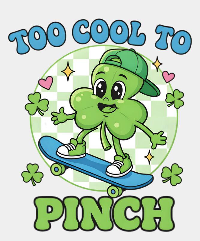 A fun and energetic St. Patrick’s Day design featuring a cool four-leaf clover rocking a backwards cap while riding a skateboard. Set against a green and white checkered circle background, with little hearts, stars, and clovers scattered around, this design is full of playful attitude. With “Too Cool To” at the top and “Pinch” at the bottom, it’s perfect for boys who want to celebrate St. Paddy’s Day in style—no pinching allowed.