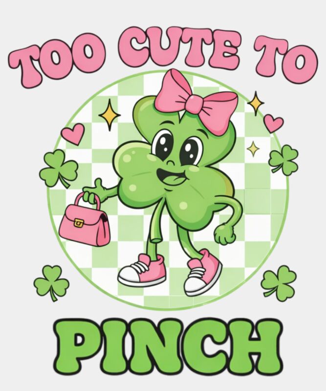 A cute and confident St. Patrick’s Day design featuring a stylish four-leaf clover with a pink ribbon on her head, pink converse-style shoes, and a matching pink bag. Set against a green and white checkered circle background with little hearts, stars, and clovers scattered around, this design is full of playful charm. With “Too Cute To” at the top and “Pinch” at the bottom, it’s perfect for girls who want to celebrate St. Paddy’s Day with sweetness, style, and a little lucky attitude—no pinching allowed.