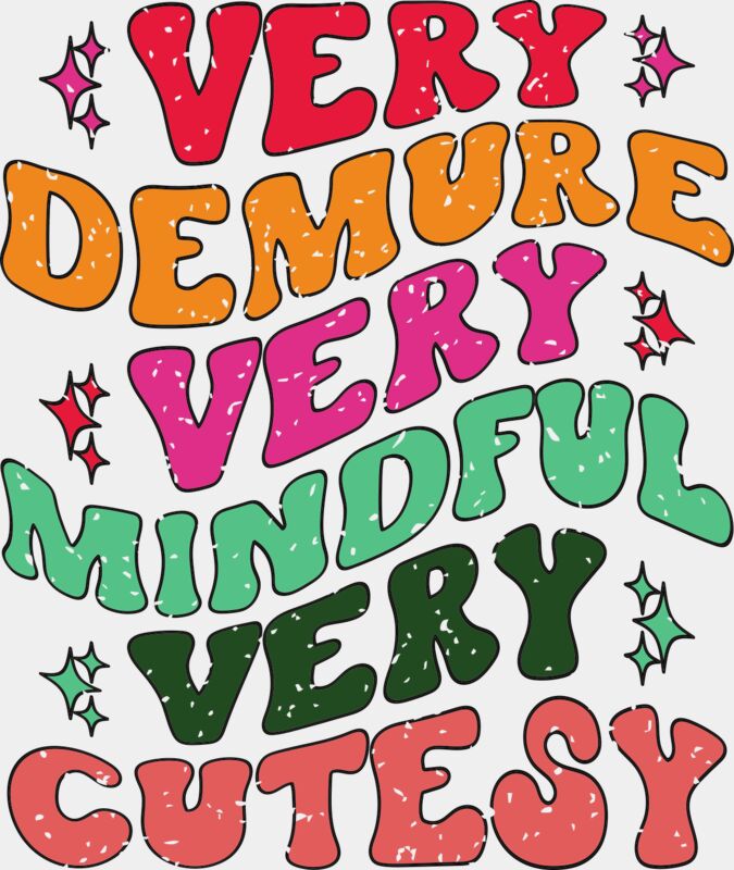 A stylish text-based design featuring the phrase “Very Demure, Very Mindful, Very Cutesy” in a retro-inspired font, blending playful wording with a soft, nostalgic aesthetic. Falling under the Wabi Sabi and mindful living trend, this design embraces simplicity, self-awareness, and a lighthearted approach to everyday life. Perfect for mums who enjoy subtle humour with a calm and trendy vibe, this design is ideal for Mother’s Day, casual wear, and relaxed everyday outfits. A charming and modern choice for mum t-shirts and personalised apparel with personality.