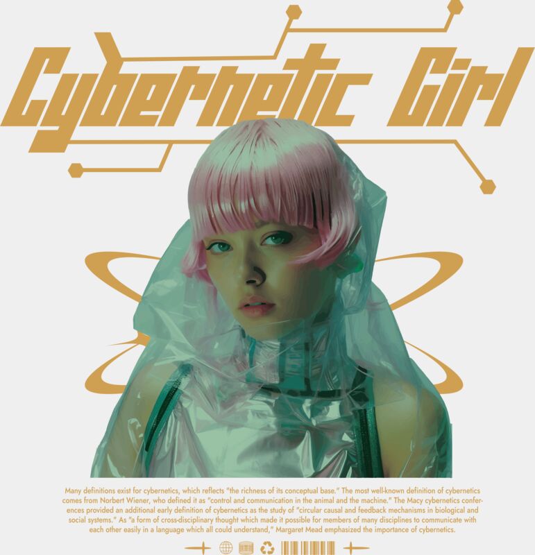 Futuristic cybernetic girl design with holographic styling and tech-inspired typography. Blending Y2K cybercore aesthetics with sci-fi fashion, this graphic is perfect for edgy streetwear, digital nostalgia lovers, and futuristic apparel collections.
