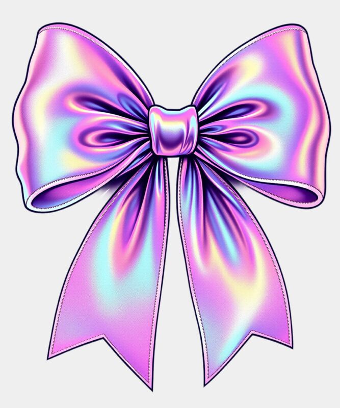 Shiny holographic bow with soft pastel rainbow reflections, perfect for coquette, girly, and Y2K fashion trends. Ideal for apparel, accessories, and feminine retro-inspired prints with a glossy chrome finish.