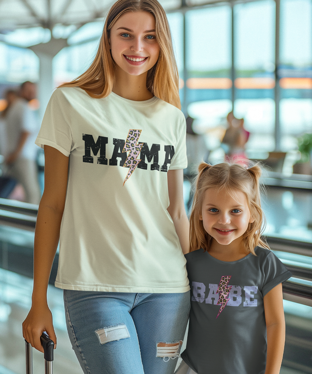 Simple, clean, and genuinely stylish. "MAMA" on Mum, "BABE" on the kid. This one doesn't need much, the pairing says everything. Works in a bold sans-serif for a more modern feel or a clean script for something softer. Either way it photographs beautifully and suits every age from a newborn onesie to a youth tee.