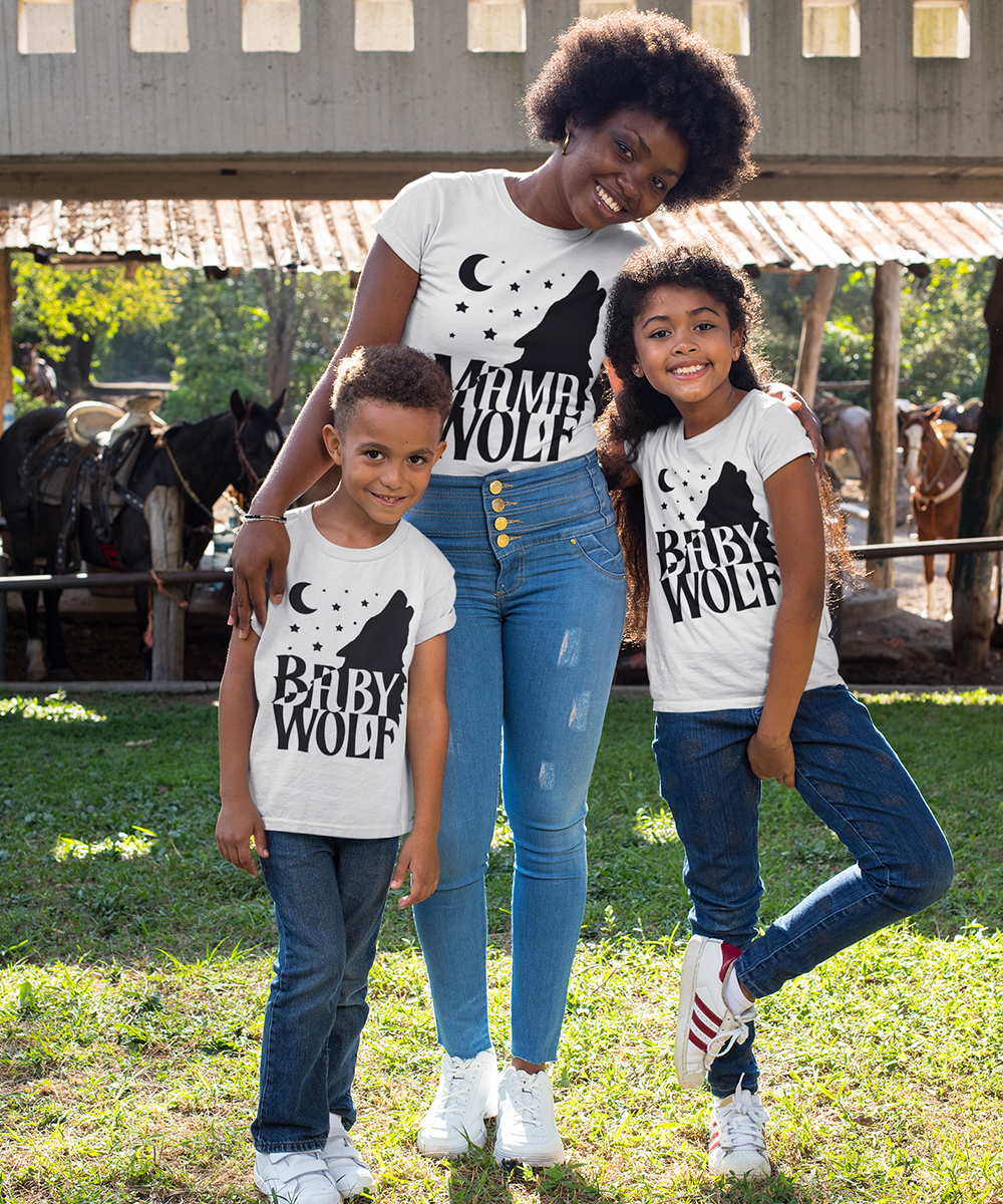 Mama Wolf and Baby Wolf on matching tees, for the mum whose energy is a little fiercer than the average bear. Bold, proud, and a bit more attitude than the classic animal pairs. This one suits mums who'd describe their parenting style as "feral but thriving" and wear it as a compliment. Available on tees, crews, and hoodies.