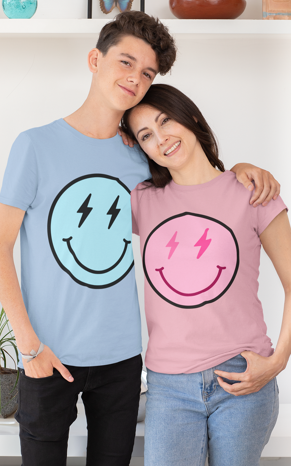 A smiley face printed on a tee shirt for Mum and Youth, available in blue and pink colourways so you can mix, match, or coordinate. One for Mum, one for the mini. A classic for a reason.
