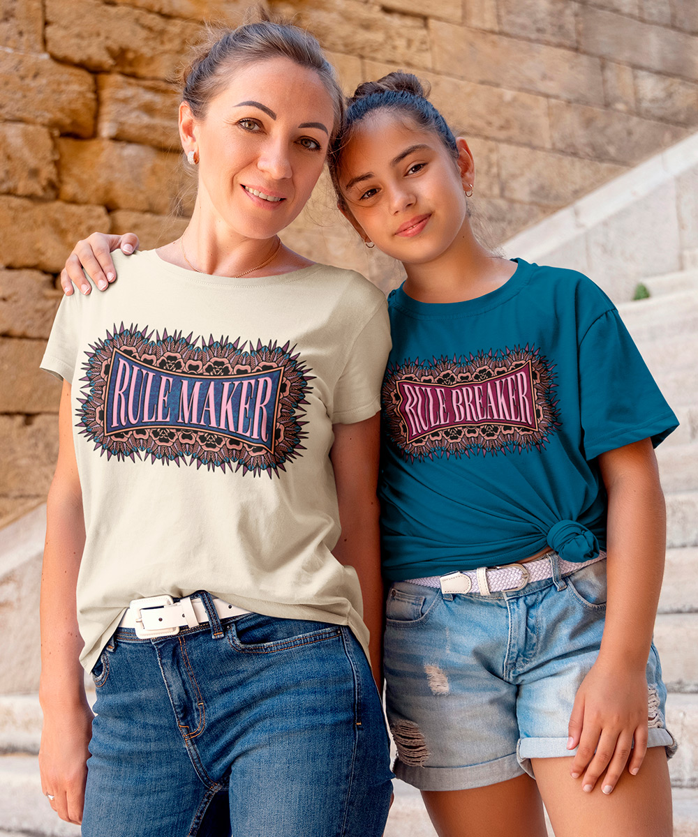 Let's be honest, this one is extremely accurate. "Rule Maker" for Mum, "Rule Breaker" for the kid. Bold, funny, and immediately understood by every person who sees it. Printed in a clean heavy font on matching tees, it's one of those sets that will absolutely end up on someone's TikTok For You Page.