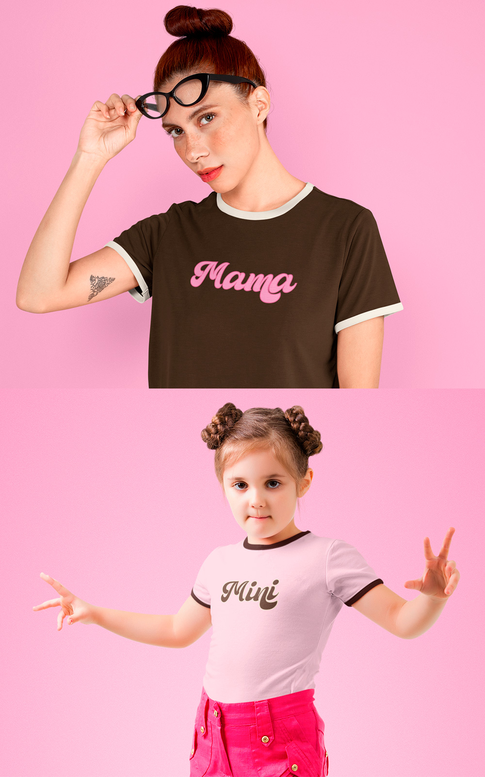Simple, clean, and genuinely stylish. "MAMA" on Mum, "BABE" on the kid. This one doesn't need much, the pairing says everything. Works in a bold sans-serif for a more modern feel or a clean script for something softer. Either way it photographs beautifully and suits every age from a newborn onesie to a youth tee.